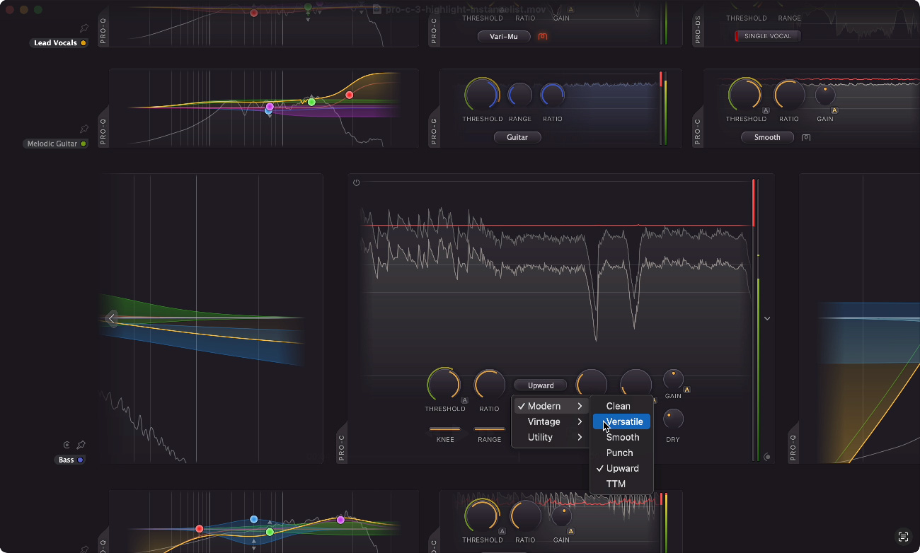 Pro-C 3 offers 14 different, program-dependent compression styles and various character modes to introduce smooth saturation, vintage color and analog drift. But there's more! You also get full immersive / Dolby Atmos® functionality (up to 9.1.6), up to 32x oversampling, unique auto-threshold, intelligent auto-gain and auto-release, a variable knee and hold, smooth lookahead external side-chain and host tempo sync triggering, variable stereo linking and mid/side processing, all packed in a beautifully designed user interface.